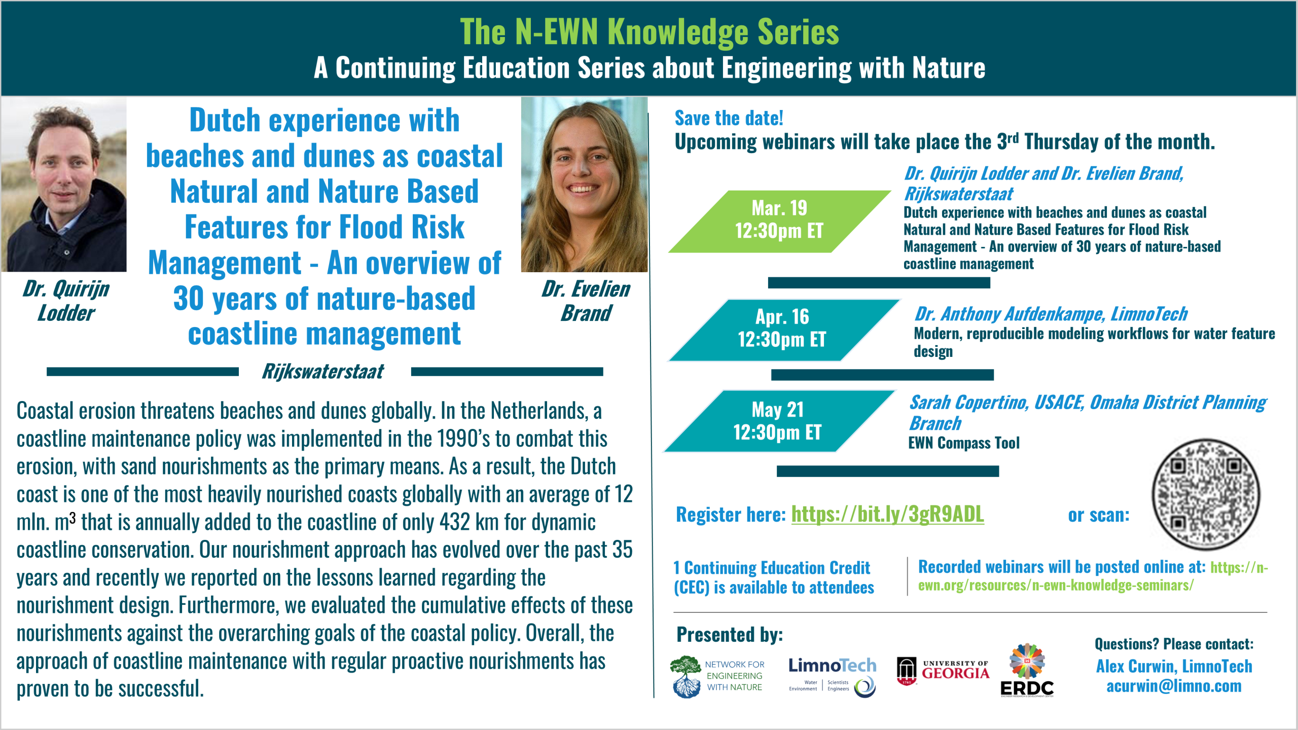 The Network for Engineering With Nature® (N-EWN) invites you to the “N-EWN Knowledge Series: A Continuing Education Series about Engineering with Nature—Dutch experience with beaches and dunes as coastal Natural and Nature Based Features for Flood Risk Management – An overview of 30 years of nature-based coastline management,” presented by Dr. Quirijn Lodder, Principal Advisor Coastal Flood Risk Management, and Dr. Evelien Brand, Technical Lead Coastline Maintenance; both of Rijkswaterstaat. This 1-hour Zoom webinar will take place March 19, 2026 at 12:30pm ET.